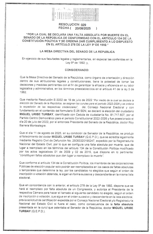 “Que el día 11 de agosto de 2025, en su condición de senador de la República, se produjo el fallecimiento del doctor MIGUEL URIBE TURBAY (Q.E.P.D.), que se acredita legalmente mediante registro civil de defunción No. 25083320195247, expedido por la Registraduría Nacional del Estado Civil, por lo que se configura una falta absoluta por muerte, que da lugar a reemplazo en los términos del artículo 134 de la Constitución Política”, se puede leer en el documento de dos páginas.