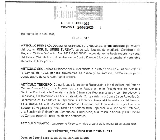 Catorce días después del fallecimiento del senador y precandidato del Centro Democrático, Miguel Uribe Turbay, producto de un atentado sicarial el pasado 7 de junio; la mesa directiva del Senado expidió la resolución 029 con fecha del 20 de agosto de 2025, con la cual se declara la falta absoluta de la curul que ocupaba Uribe Turbay.